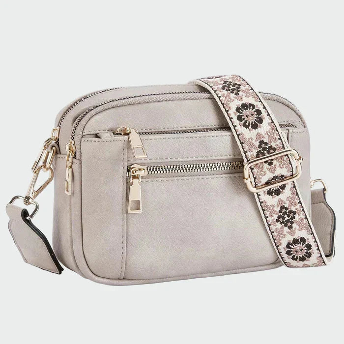 Elegantní kabelka přes rameno v černé barvě s moderním a praktickým designem. Disponuje dvěma vnějšími zipy s kovovými detaily ve zlaté barvě, které dodávají luxus a funkčnost. Široký textilní popruh s působivým vzorem poskytuje jedinečný charakter a pohodlí při nošení. Ideální pro každodenní použití, ale také pro zvláštní příležitosti.